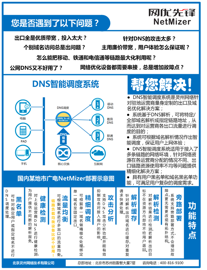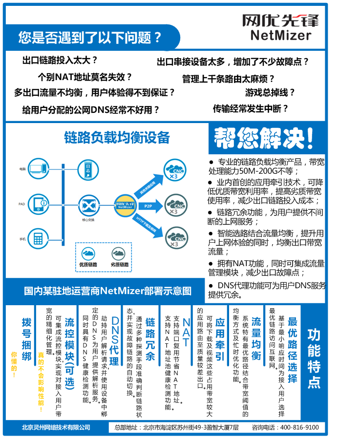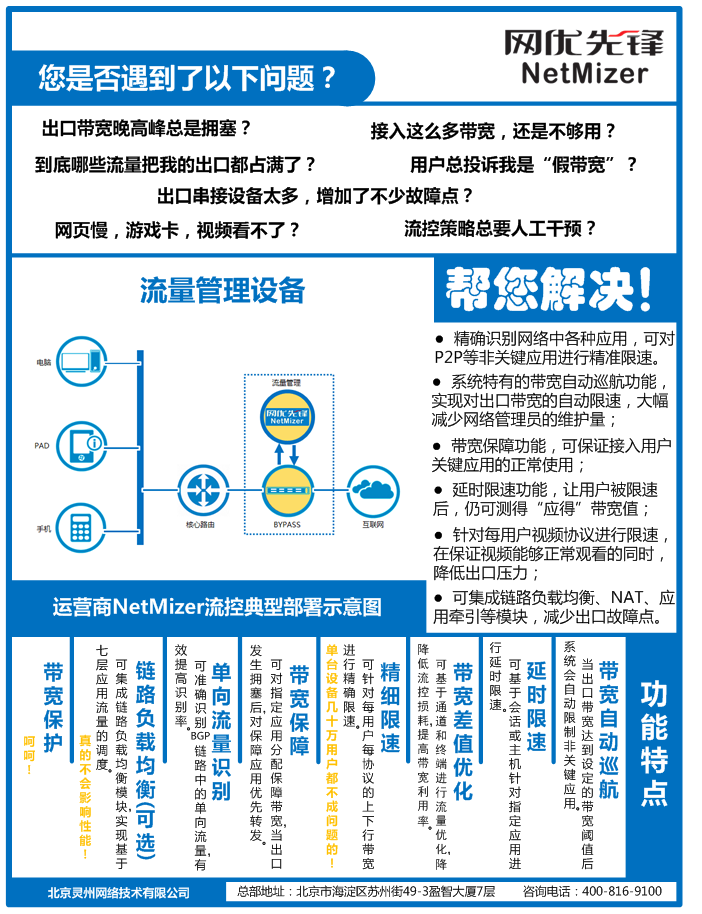北京英頓師林網絡技術有限公司榮幸參展,靈州網絡成立于2002年(nián), 擁有(yǒu)自(zì)主研發品牌:網優先鋒(NetMizer),是(shì)經北(běi)α京市(shì)科(kē)委認定的(de)高(gāo)新技(jì)術(shù)企業(yè),是(shì)國(guó)內(nèi)最早從(cóng)事(shì)網絡優化(huà)設備制(zhì)造商∞。經過10多(duō)年(nián)的(de)努力與積累,已擁有(yǒu)完善的(de)為(wèi)廣電(diàn)領域客戶提供IP流控、鏈路(←lù)負載均衡、NAT、網絡安全等一(yī)體(tǐ)化(huà)解決方案。